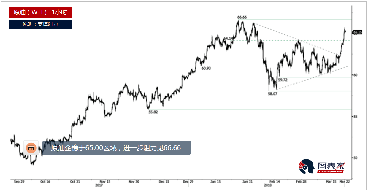 上图为黄金1小时走势,价格进入横盘整理,技术指标暗示短线盘整,后市可能上探阻力位1338。 小时支撑位于1300(2017年12月29日低点),阻力位于1338(2018年2月19日高点)。 香港国泰金业官方IB号码:51500 QQ:517695832 上图为白银1小时走势,价格上行动能公示略收敛,目前交投于16.50水平上午位置,料后市价格或将进一步上扬,目标位16.65区域。 小时支撑位于16.03(2017年12月18日低点),阻力位于16.98(2018年2月15日高点)。 上图为原油1小时走势,看涨走势暂有停缓,技术指标暗示价格将进行短线盘整,由于此前价格突破64.14强阻力位,料后市或企稳于65.00附近区域,进一步阻力见66.66。 小时支撑位于59.72(2018年2月15日低点),阻力位于66.66(2018年1月25日高点)。