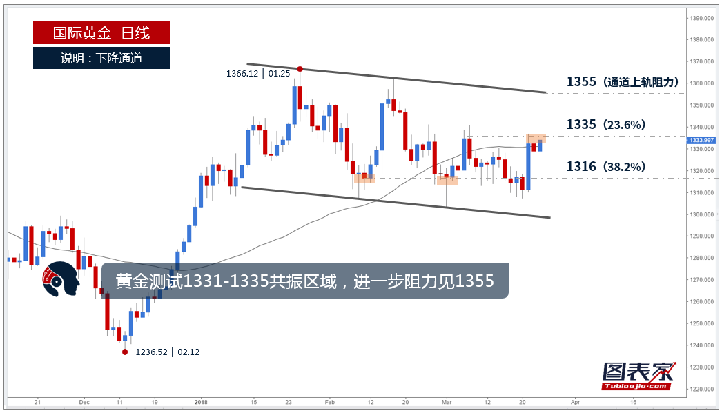 图为黄金日线走势,价格正在测试50日均线和斐波那契23.6%回调位组成的强阻力区域1331-1335,上方阻力为通道上轨1355附近。